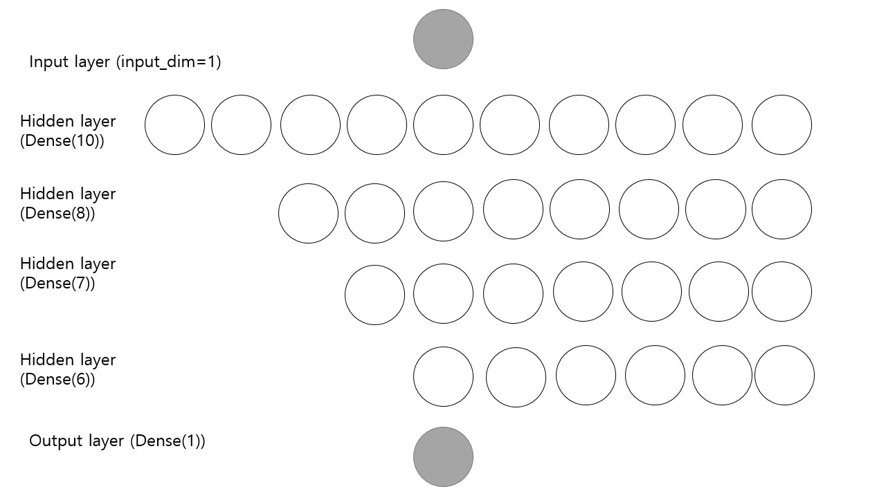 이번 모델은 히든레이어 4개에 각 노드를 10개, 8개, 7개, 6개를 만든 것입니다.
