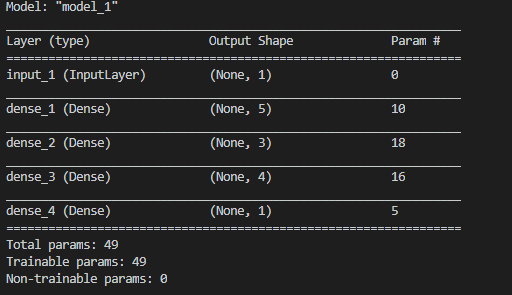 (None, 5)이라는 뜻은 None개의 행과 5개의 아웃풋 값이 주어졌다는 것을 뜻합니다. 행이 None으로 지정되는 이유는 데이터의 갯수는 계속해서 추가될 수 있기 때문에 딥러닝 모델에서는 주로 행을 무시하고 열의 shape을 맞추어주는 작업을 많이 수행합니다. 첫번째 레이어의 아웃풋 갯수는 5, 두번째 레이어의 아웃풋 갯수는 3, 마지막 레이어의 아웃풋 갯수는 1임을 뜻합니다.