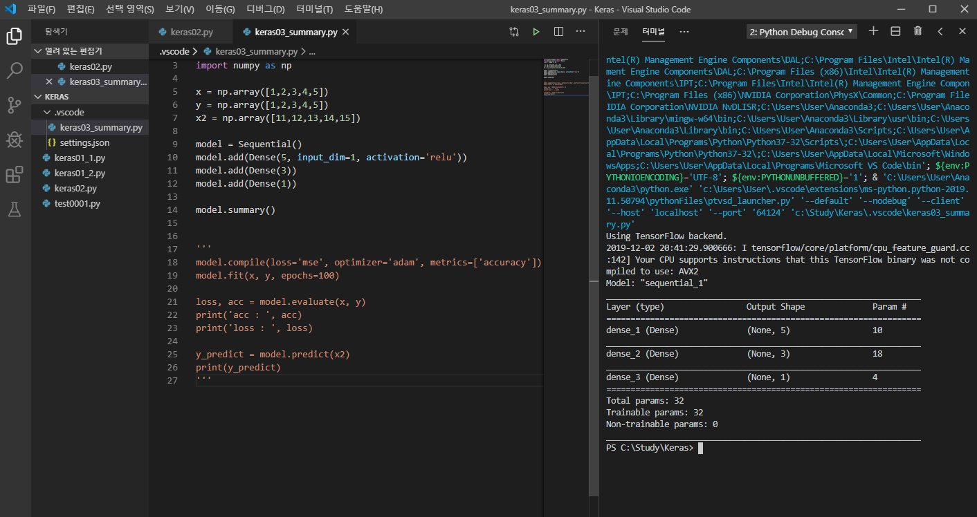 와 같은 다양한 레이어들이 존재합니다. 이를 이용해 다양한 모델을 구성하거나 이전에 구성했던 모델을 불러와서 재사용, 추가 등을 할 수도 있고 차근차근 다뤄볼 예정입니다. 이를 이용해 다양한 모델을 구성하면 위 예제와 같이 파라미터로 준 값이 입력, 출력 노드개수 그대로 출력되지 않는 경우도 많습니다. 그때는 또 summery를 보는 방법이 달라지게 됩니다.