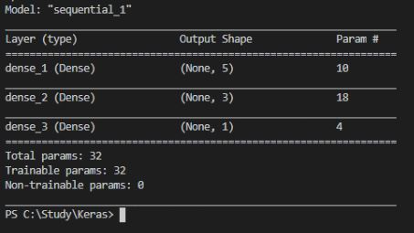 레이어의 이름과 타입을 나타냅니다. 알아서 레이어의 이름을 지정해줍니다. 따로 지정해주고 싶을때는 Dense에 파라미터로 name='지정하고싶은 이름'을 주면 됩니다. dense_1, dense_2, dense_3 이라고 이름 붙여진 3개의 Dense레이어가 생성된 것을 볼 수 있습니다.