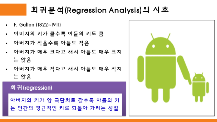 먼저 '회귀'라는 말은 '한바퀴 돌아 제자리로 돌아가다'라는 뜻입니다. 먼저 회귀(Regression)이라는 용어 때문에 회귀모델을 이해하는데 약간의 혼란이 있을 수 있습니다. 사실 회귀모델에서 회귀의 정확한 의미는 '평균으로의 회귀'라는 뜻이라고 봐도 무방합니다.데이터의 실측치와 모델의 실측치 사이의 차이, 즉 회귀식에서 오차항에 대한 관측치(잔차)가 평균으로 회귀하는 것이 바로 '회귀' 입니다. 정확한 모델에서는 잔차가 평균 0으로 회귀하게 됩니다.