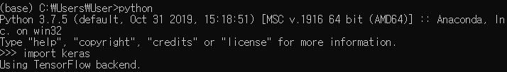 Using TensorFlow backend라고 뜨면 정상적으로 설치가 된 것입니다.