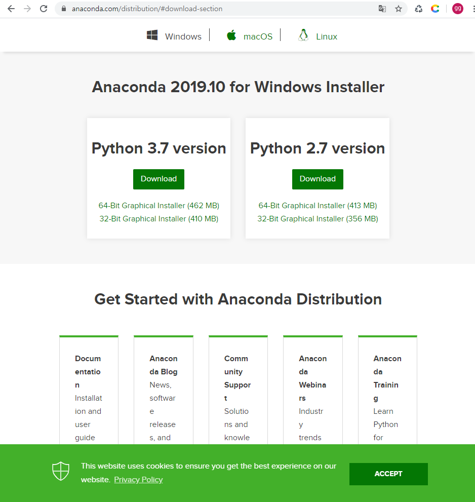 2019/12/27 기준 파이썬3.7버전을 지원하는 아나콘다 4.8.0을 다운받을 수 있습니다. 자신의 운영체제와 비트에 맞는 것을 다운로드 누릅니다.
