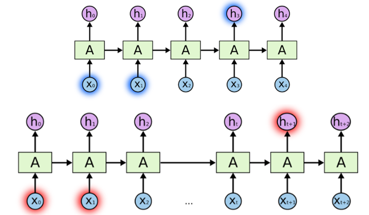 만약 "하늘에 떠있는 구름"이라는 문장을 RNN이 학습한다면 "하늘에 떠있는"이라는 문장만 가지고도 "구름"이라는 단어가 유추가 가능할 것입니다. 제공된 데이터와 배워야할 데이터의 차이가 크지 않기 때문에 과거 데이터 기반으로 학습을 할 수 있는 것입니다. 그러나 "나는 한국에서 자랐고 나는 한국어를 유창하게 한다." 라는 문장이 있을때, "나는 한국에서 자랐고 나는 ---를 유창하게 한다"에서 ---부분을 예측해야 한다면, "나는 한국에서 자랐고"와 "나는 ---를 유창하게 한다"라는 두 문장은 문장표현의 순서상 갭이 큰 문장에 속합니다. 그래서 RNN은 두 정보의 문맥을 연결하기 힘들어집니다.