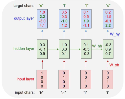위의 그림은 문자가 주어졌을때 다음 문자를 예측하는 RNN모델입니다. 예를들어서 'helo'를 입력하면 'hello'를 출력하게 만드는 모델입니다. 여기서는 [h,e,l,o] 4가지 알파벳만 사용하기 때문에 각각을 one-hot vector로 바꾼다면 h는 [1,0,0,0], e는 [0,1,0,0], l는 [0,0,1,0], o는 [0,0,0,1]로 나타낼 수 있습니다. 그리고 이 값을 입력해 주고, [0.3,-0.1,0.9]라는 h1상태를 만들었습니다. 이것을 바탕으로 y1인 [1.0,2.2,-3.0,4.1]를 만들었습니다. 이것과 마찬가지로 다음 상태들을 생성할 수 있습니다.(모두 갱신할 수 있습니다.) 이렇게 순차적인 방향으로 나아가는 것을 순전파라고합니다. RNN도 다른 신경망들처럼 정답이 필요합니다. 모델에 정답을 알려주어 보다 더 정확한 parameter값을 갱신할 수 있습니다. 위의 예에서는 h-e-l-l-o순서로 정답입니다. output layer에서 초록색 글자 부분은 정답을 의미하는데, one-hot vector로 변환된 정답의 인덱스 부분을 뜻합니다.이 정보로 역전파(backpropagation)을 수행하여 parameter값을 갱신해 나갑니다. 여기서 말하는 parameter란 W_xh, W_hy를 뜻합니다. 즉, input layer의 결과값, hidden layer의 결과값을 의미합니다. (출처)