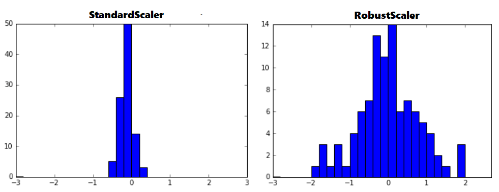 모든 특성들이 같은 크기를 갖는다는 점에서 Standard Scaler와 비슷하지만, 평균과 분산 대신 Median과 IQR(interquartile range)을 사용하며, 이상치(Outlier)의 영향을 최소화 합니다. StandardScaler와 비교해보면 표준화 후 동일한 값을 더 넓게 분포 시키고 있음을 확인 할 수 있습니다.