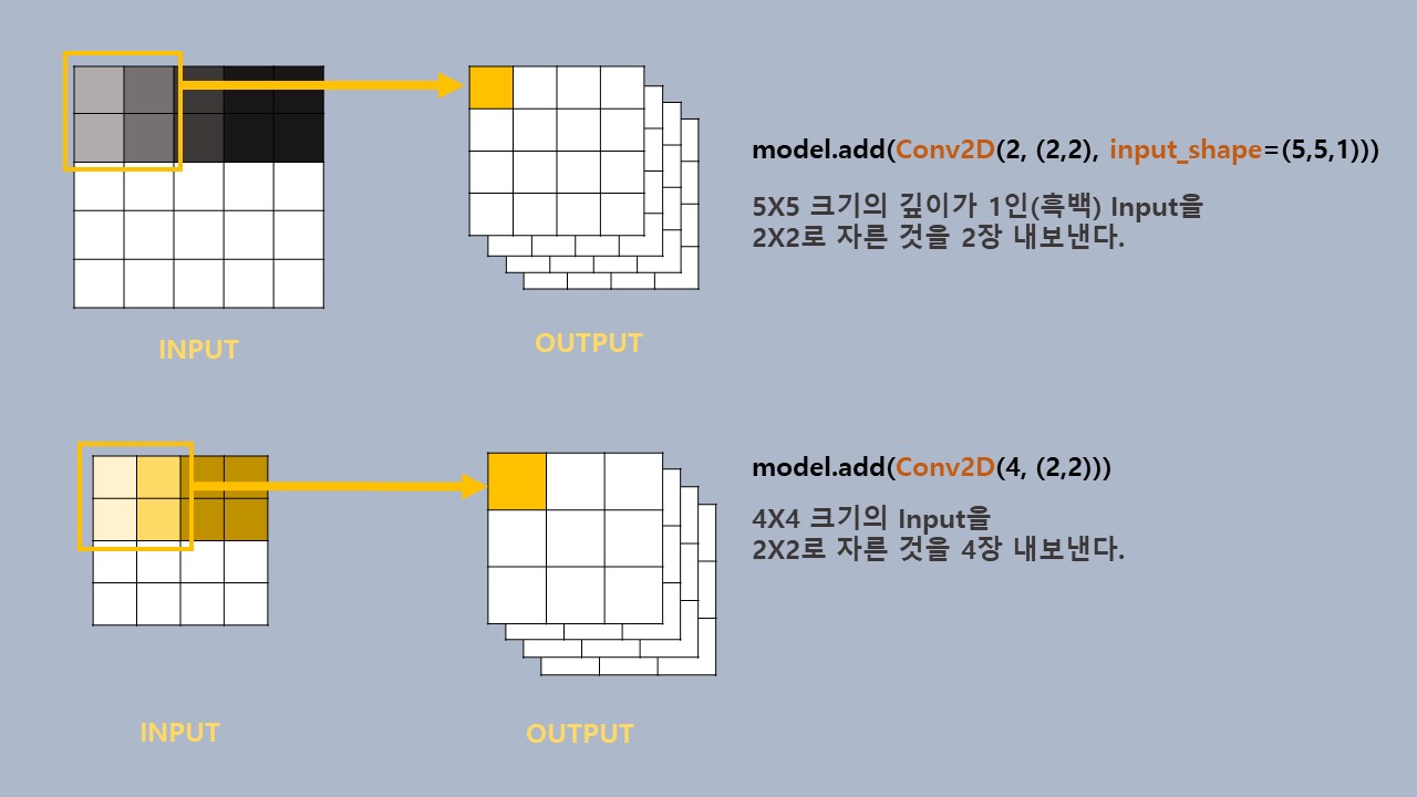 # Conv2D에서 5*5 그림을 3*3으로 자르면 다음 레이어(Flatten)으로 3*3짜리 7장이 나감 -> (3,3,7) 가로,세로,필터