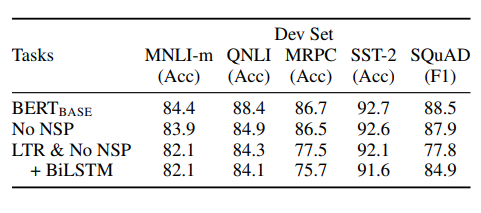 No NSP는 MLM만 적용한 경우, LTR & No NSP는 MLM과 NSP를 둘 다 적용하지 않은 기존의 좌우 모델을 사용한 경우 입니다. 확실히 모든 면에서 BERT base(MLM+NSP)의 모델이 뛰어난 성능을 보여줍니다. (영어 모델 기준)