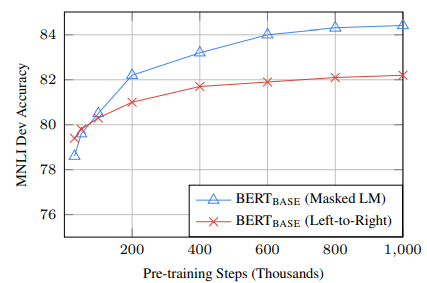 논문에서는 기존(좌우로 학습하는 모델)방식과 비교하여 MLM방식이 더 좋은 성능을 보여주고 있다고 말합니다!