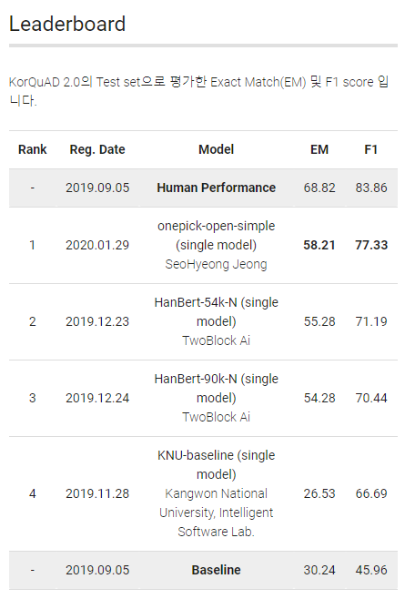 한국어 Machine Reading Comprehesion 데이터셋 KorQuard로 QA대회 'KorQuard'의 리더보드의 상위 성적을 기록한 대부분의 참가자들은 이 언어모델 BERT를 사용하였다고 합니다.