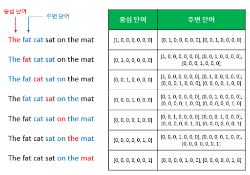 예를 들어 '우리집 강아지는 공을 정말 좋아한다.' 라는 문장에서 '공' 부분을 맞춘다면, '우리집', '강아지', '는', '을', '정말', '좋아', '한다' 의 단어들을 가지고 '공'을 예측해야 합니다. 이 때 예측해야 하는 단어 '공'이 중심 단어(center word)이고, 나머지 단어들을 주변 단어(context word)라고 합니다.