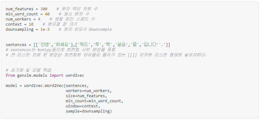 - sample : 빠른 학습을 위해 정답 단어 라벨에 대한 다운샘플링 비율을 지정하는 것, 보통 0.001이 좋은 성능을 낸다고 한다.