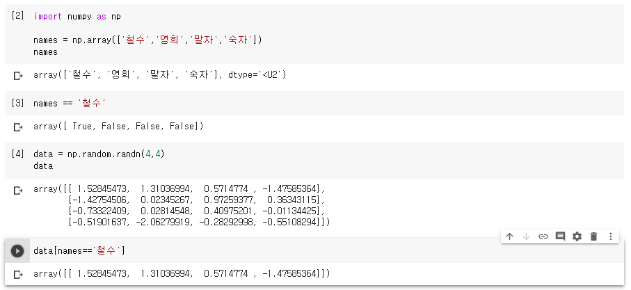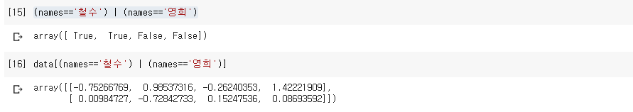 비교 연산자 ==를 array에 바로 적용할 때 True, False 값이 각 array 값에 설정되며 이를 불리언 색인으로 사용할 수 있습니다.