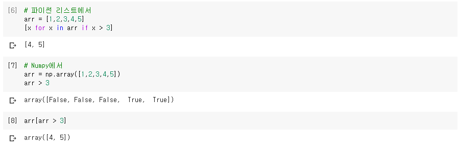1차원 배열인 arr에서 3보다 큰 값을 모두 추출하고, True에 해당하는 index의 array값만 반환 할 수도 있습니다.