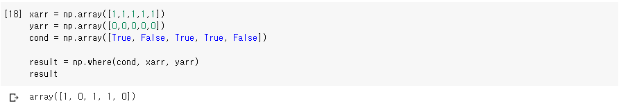 조건절은 np.where(조건, x, y)를 사용하여 표현할 수 있습니다. 조건이 참이면 x의 원소를 거짓이면 y를 원소로 하는 벡터를 반환합니다.