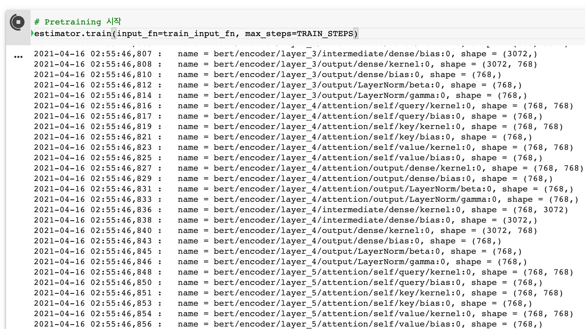 estimator.train을 통해 bert pretrain을 시작합니다.