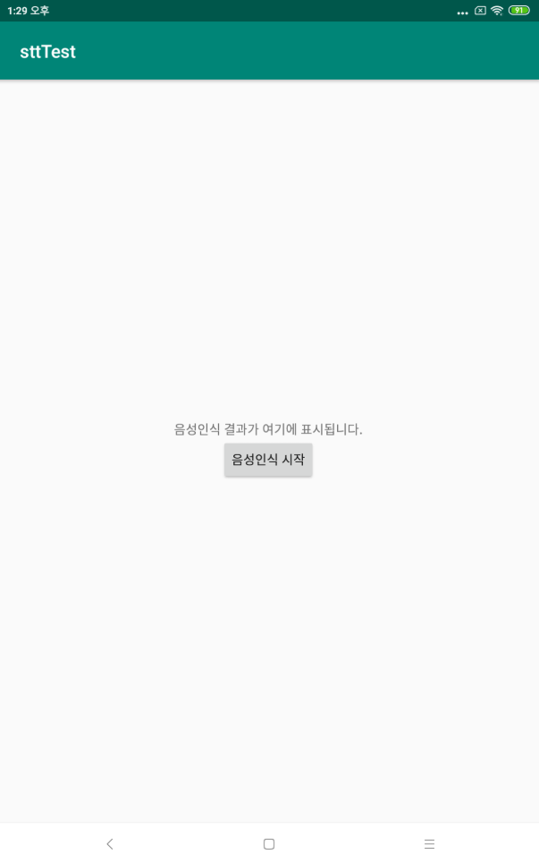 화면은 음성인식 시작 버튼과 음성인식 결과 텍스트뷰만 생성하였습니다.