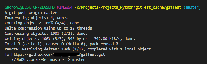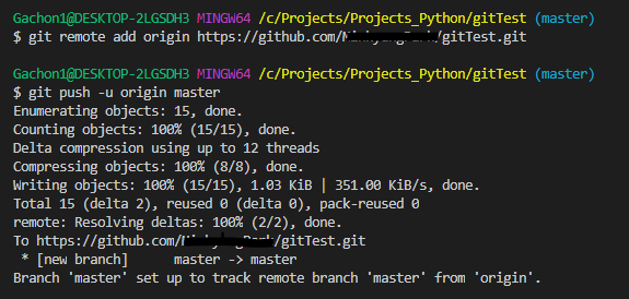 만약 컴퓨터에서 처음 사용하는 계정이라면 유저네임과 패스워드를 물어볼텐데, 본인의 유저네임과 비밀번호를 입력해주면 됩니다. 연동이 완료되면, 이 컴퓨터(로컬)의 Master브랜치가 원격의 마스터 Origin을 추적한다는 메세지가 제일 마지막에 뜨게 됩니다.