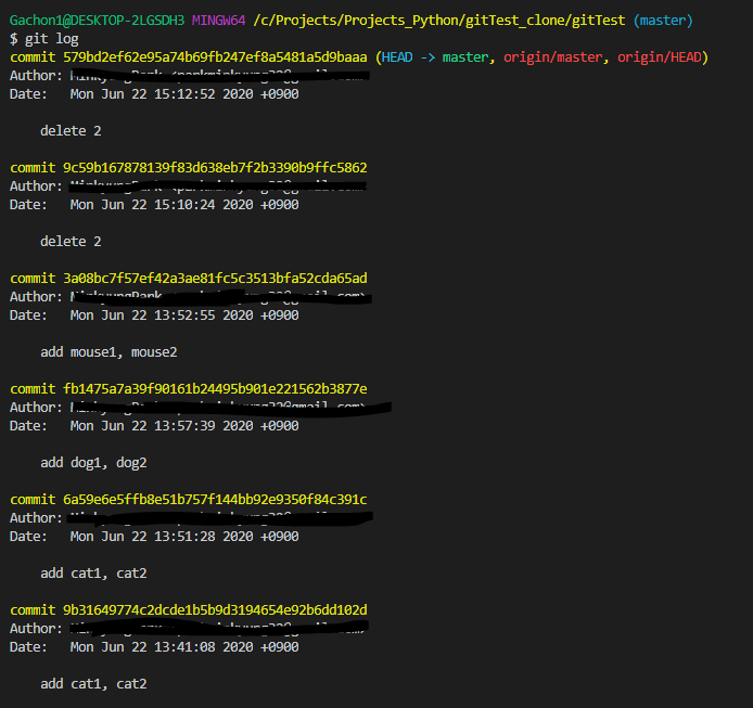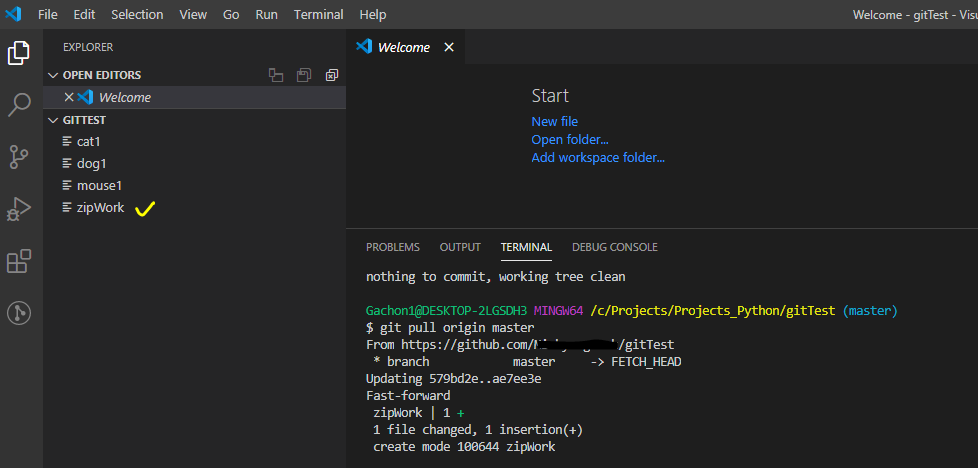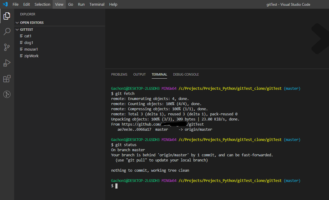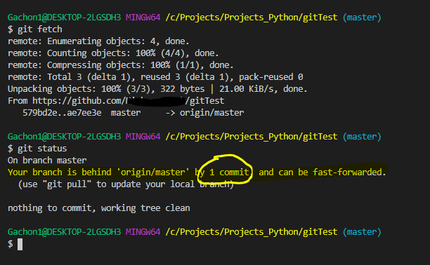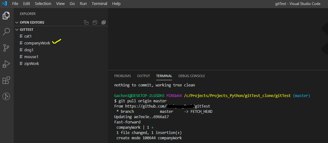 변경사항이 반영되지 않은 원래의 폴더 즉, 회사에서의 폴더 gitTest에서 다음과 같은 명령어를 입력합니다.