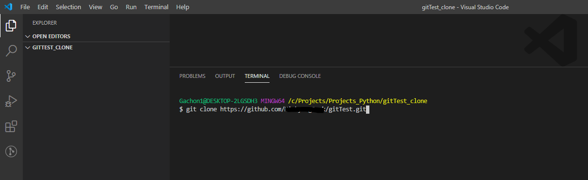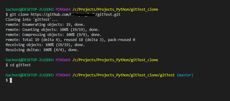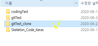 이렇게 되면 gitTest_clone 폴더 안에 원격 저장소의 gitTest 파일이 내려받아지게 됩니다.