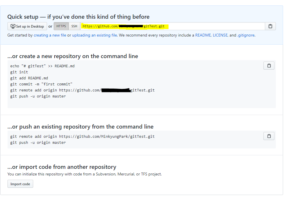 이 후 간단한 명령어에 관한 설명이 뜨고요. 저 노란줄 쳐진 내 저장소의 주소를 이용해서 로컬 저장소에 연결해 볼 것입니다.