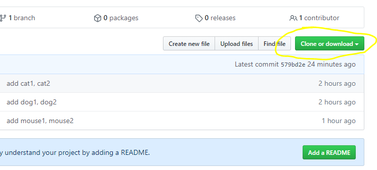 먼저 내려받을 깃허브의 원격 저장소로 이동 후, Clone or download 버튼을 클릭하여 주소를 복사합니다.