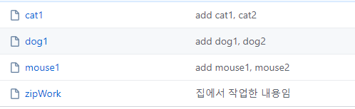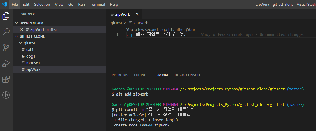 집에서 먼저 zipWork 파일을 생성하고 여러 작업을 수행하고 add, commit을 합니다. 이 때 반드시 gitTest_clone안의 gitTest 폴더에 작업을 수행해주어야 합니다.