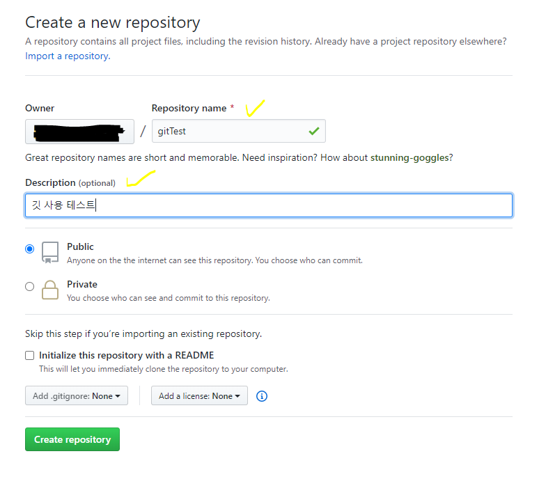 이 깃으로 관리되는 레파지토리 하나가 원격으로 저장되는 공간입니다. 원하는 저장소명과 간단한 설명 입력 후, Create repository 버튼을 클릭하면 저장소가 생성됩니다. Public을 선택하면 내 레파지토리를 모든 사람에게 공개하게 되고 Private는 나와 내가 초대한 사람만 이 저장소를 볼 수 있게 하는 옵션입니다. 만든 후에도 변경 가능한 옵션이기 때문에 크게 고민하지 않으셔도 됩니다.