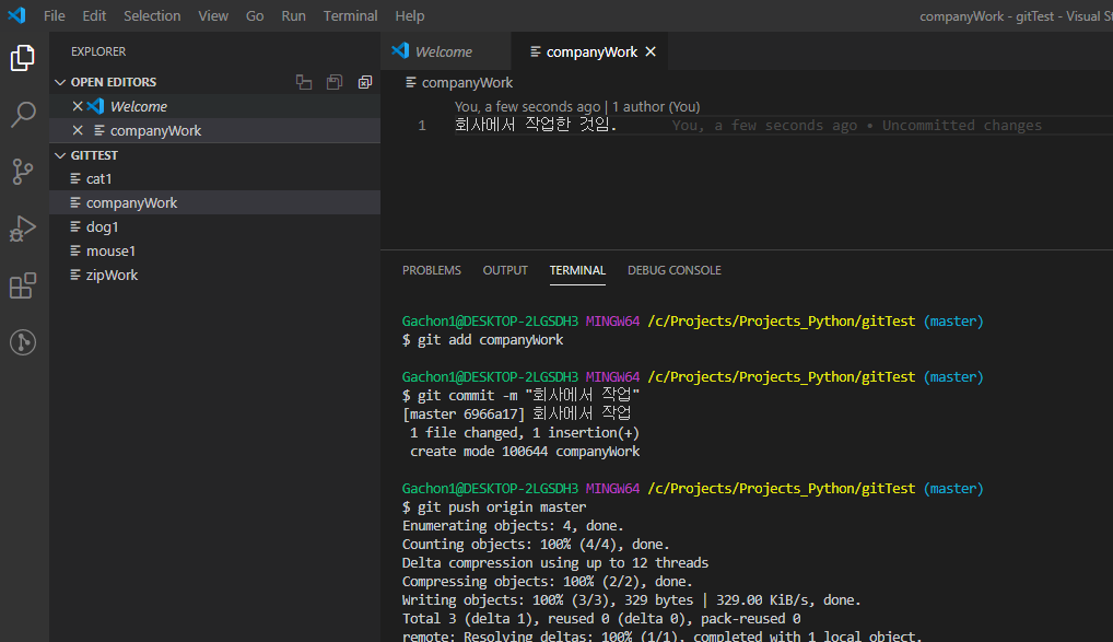 gitTest 폴더가 회사의 컴퓨터에 있다고 가정합시다.