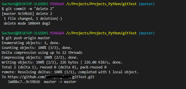 그러면 수정된 내용이 깃허브의 원격 저장소에 반영됩니다. 저는 dog2 파일을 삭제 후, add, commit, push를 진행하였습니다.