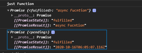 일반 함수인 justFunc()은 리턴으로 준 문자열 'jusf function'이 그대로 리턴되지만,