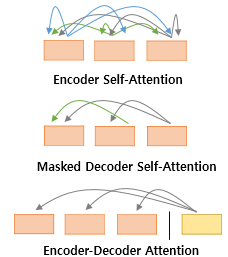 인코더의 셀프 어텐션 : Query = Key = Value 디코더의 마스크드 셀프 어텐션 : Query = Key = Value 디코더의 인코더-디코더 어텐션 : Query : 디코더 벡터 / Key = Value : 인코더 벡터