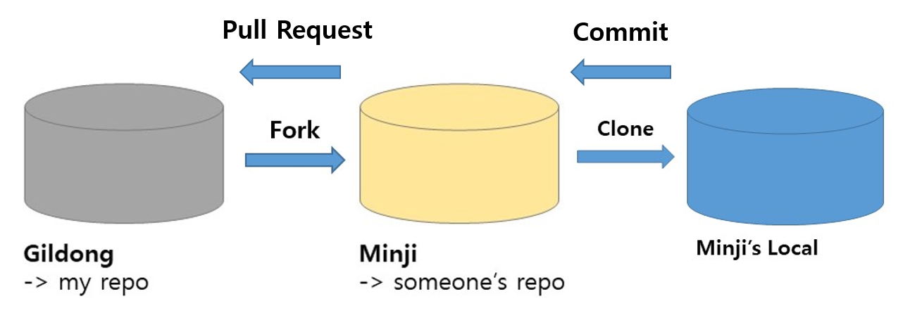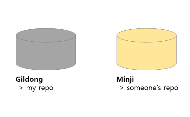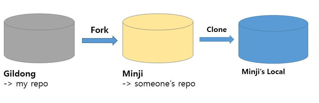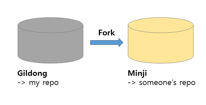 이때 Fork를 이용합니다. 포크로 쿡 찔러 가져오듯 다른 사람의 저장소에 있는 레포지토리를 내 원격 저장소, 깃허브로 가져오는 것입니다. Minji라는 유저가 Gildong의 레포지토리 중 하나를 Fork하였다면 Minji의 github 에 해당 레포지토리가 그대로 가져와 집니다.