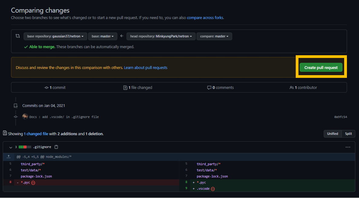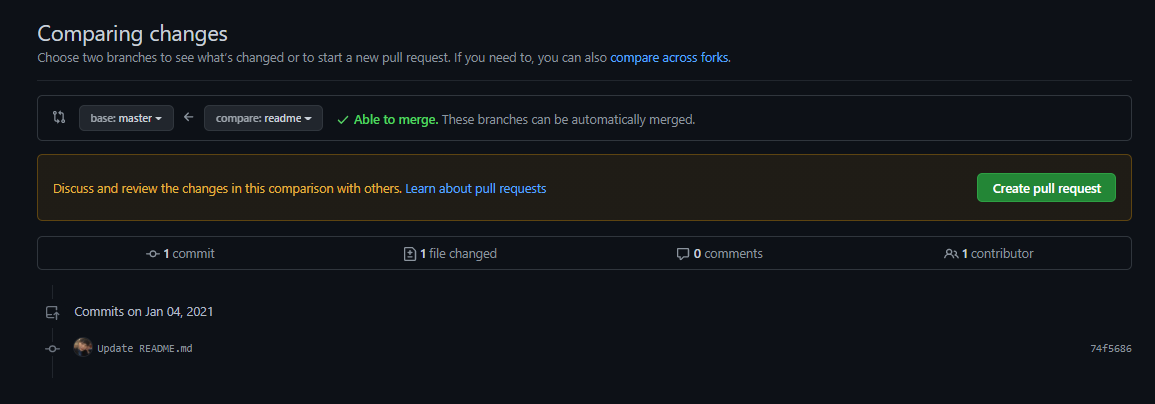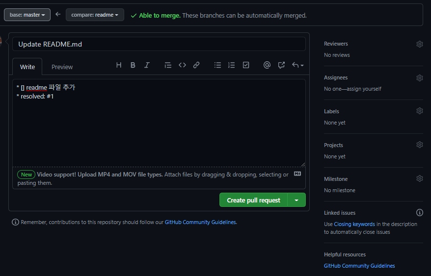 그리고 커밋하고 푸쉬하고 생성한 브랜치에 대해 원격 저장소에서 pull request를 생성해줍니다.