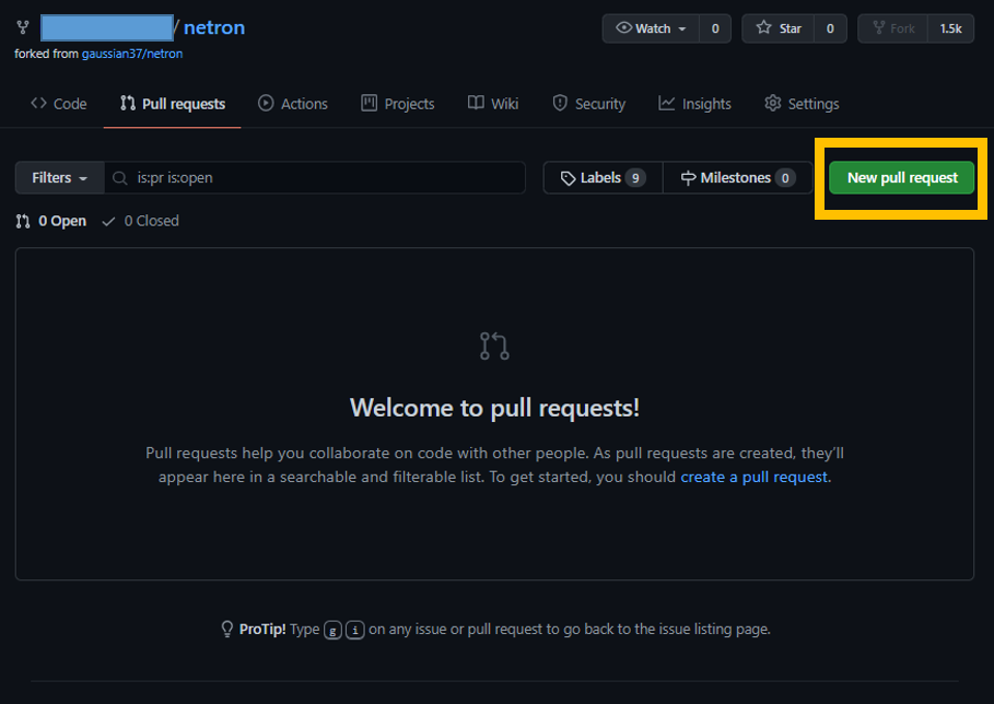 3) 이제 상단에 Pull requests 를 클릭하면 새로운 pull request를 생성할 수 있는 "New pull request"를 클릭.