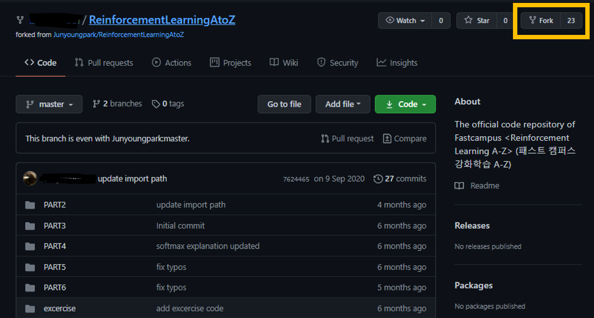 1) Fork하기 원하는 저장소에 상단에보면 Fork 버튼이 있습니다. 이를 클릭해서 Fork합니다.
