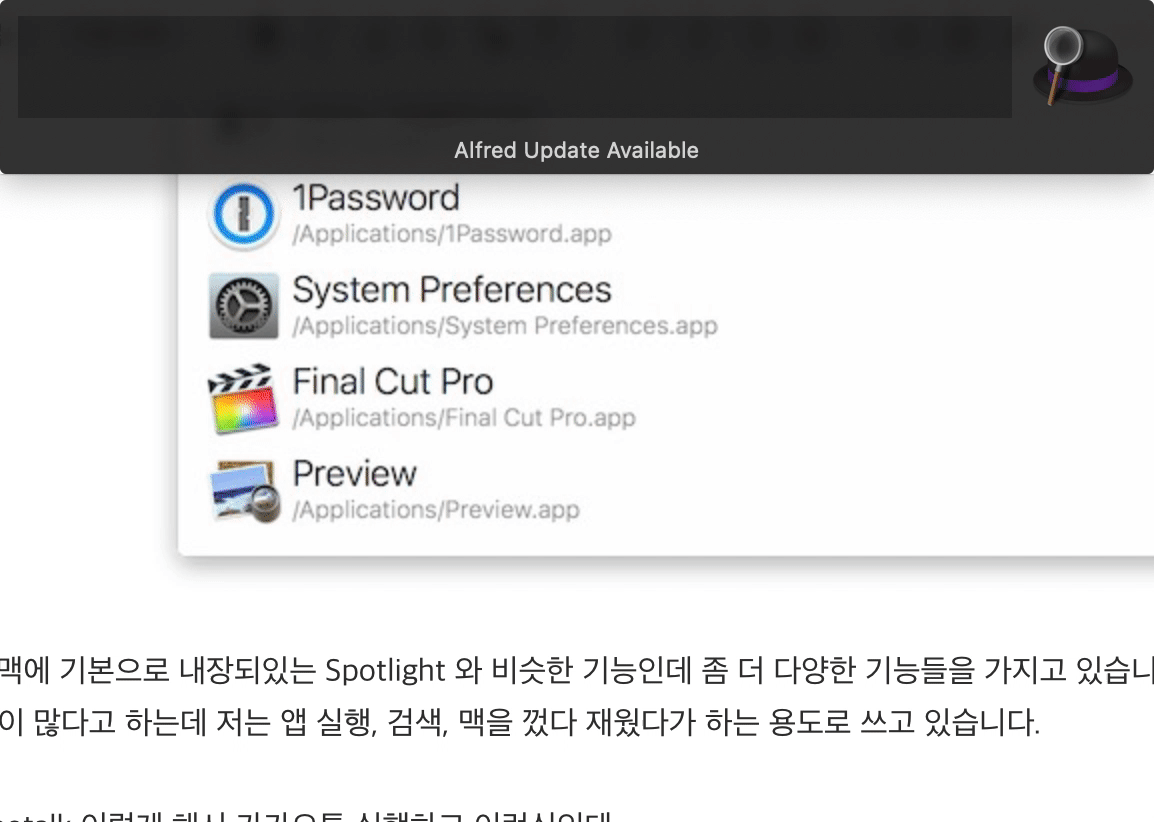 Alfred는 맥에 기본으로 내장되있는 Spotlight 와 비슷한 기능인데 좀 더 다양한 기능들을 가지고 있습니다.