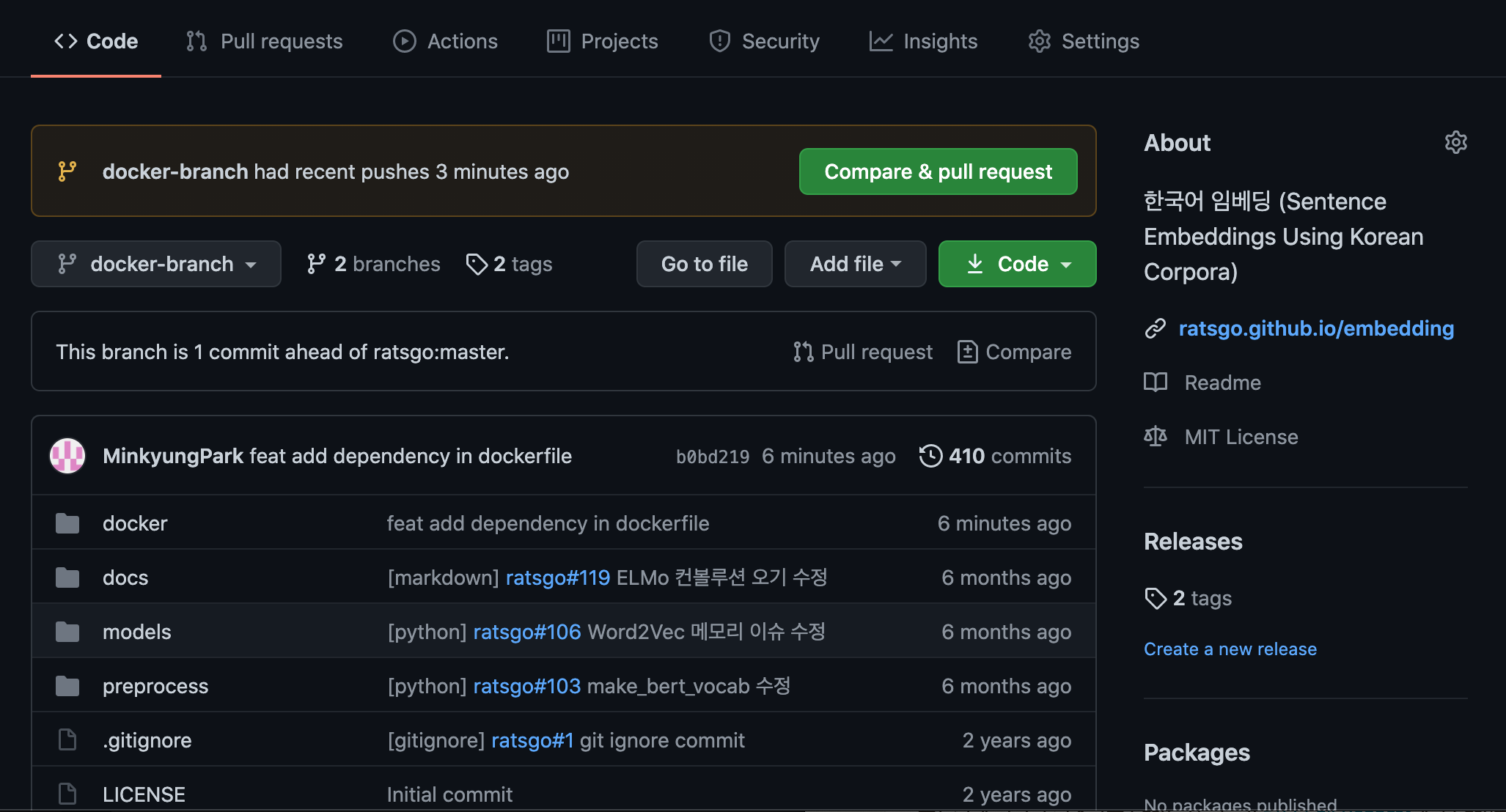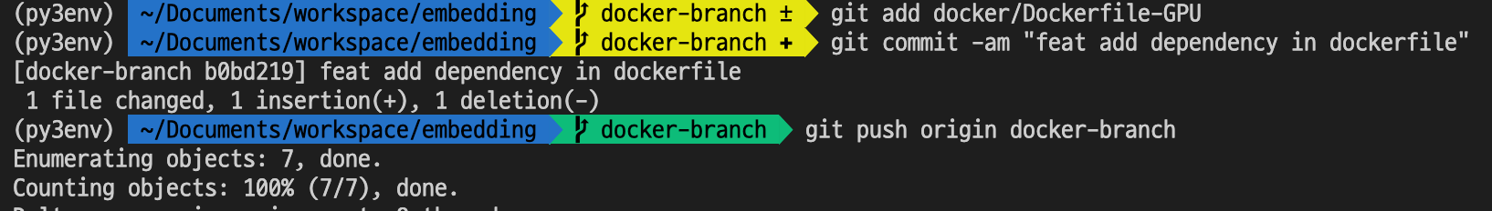 그리고 수정한 내용을 반영한 토픽 브랜치를 하나 생성합니다. 저는 Dockerfile을 수정했으므로 이름을 docker-branch라고 했고, 토픽 브랜치 명은 수정 또는 개발한 기능 토픽과 관련된 네이밍을 붙여주면 좋습니다.