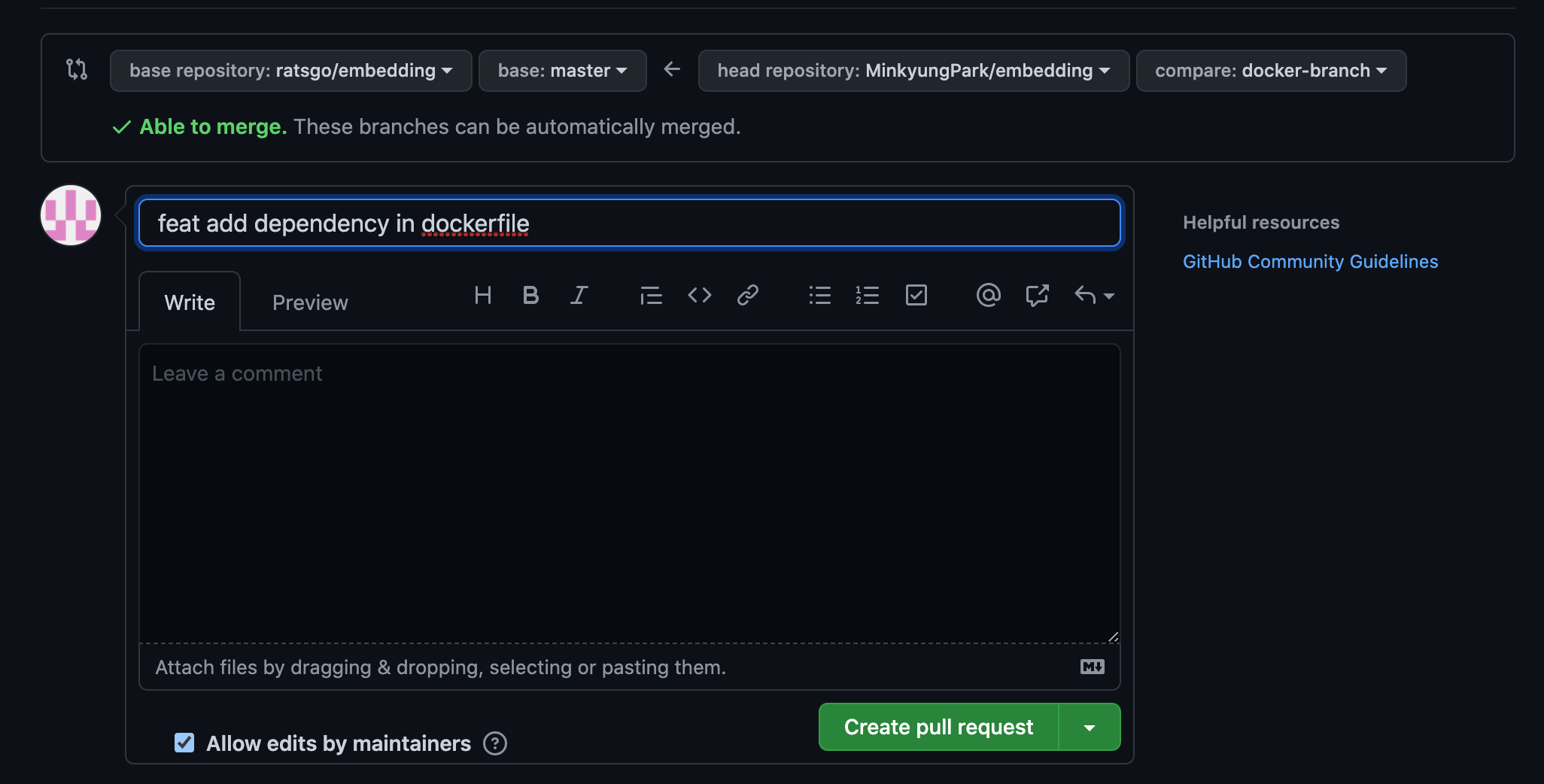 Pull request 버튼을 클릭하면 Pull request의 제목과 설명을 입력하는 화면이 뜨고 내가 수정한 코드가 반영이 될 수 있도록 원본 소유자에게 pull request를 보낸 이유와 코드에 대한 설명 얼마나 이것이 가치 있는지 공들여 작성해야 한다고 합니다.