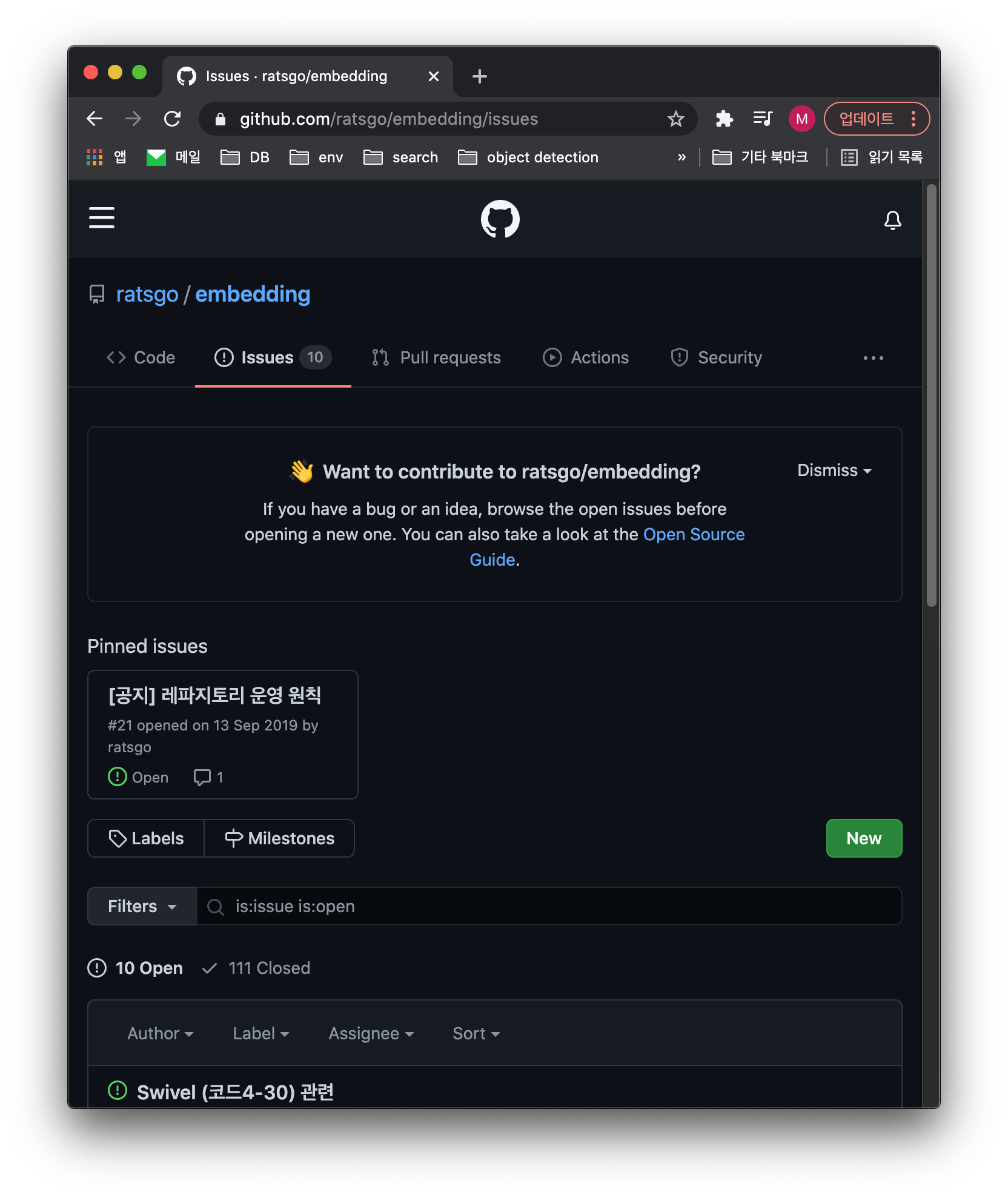 내가 기여하고 싶은 내용을 프로젝트를 살펴보며 생각할 수 있다면 좋겠지만, 그렇지 않을 경우 레포지토리의 ISSUE 페이지에서 발행된 이슈들을 살펴보며 기여할 내용을 찾아봐도 됩니다. 위 그림의 저자는 Open Source Guide까지 제공하고 있고 이처럼 원 저자가 가이드를 제시한 경우 이에 맞춰서 Pull request를 보내야 합니다.