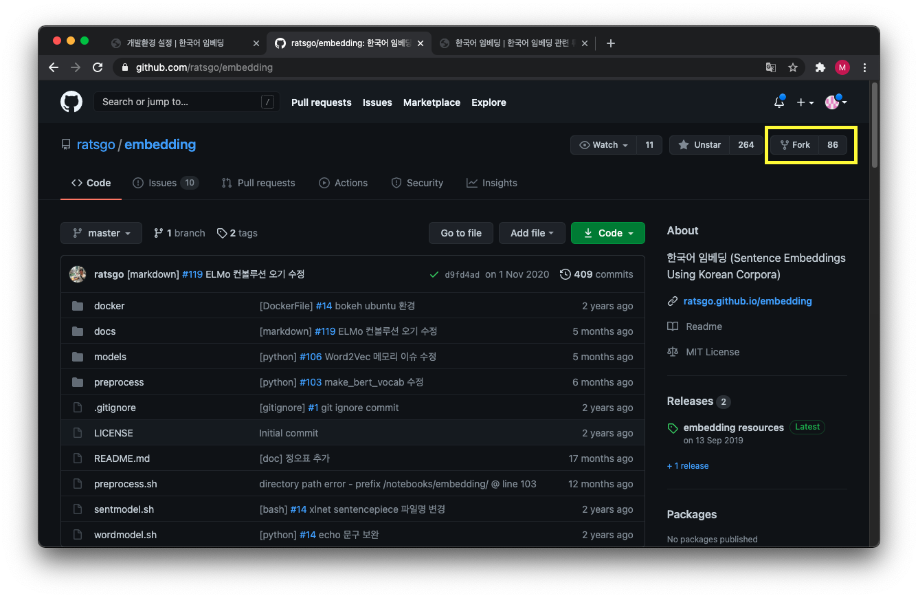 먼저 기여하고 싶은 git 레포지토리를 찾았다면 해당 레포지토리에서 Fork 버튼을 눌러 내 github에 똑같은 프로젝트가 다운 받아지도록 합니다. 그리고 이제 코드를 수정해서 pull request를 보내면 되는데, github 인터페이스에서 바로 코드를 수정해도 되지만, 보통은 환경을 설정해야 하기 때문에 해당 프로젝트를 내 로컬에 clone하여 다운받아 환경을 설정합니다. 친절하게 도커파일이나 yml, requirements.txt 같은 환경관련 파일을 생성해놓은 저자(원천소스제공자)도 있겠지만 그렇지 않다면 직접 환경을 구축해야 합니다.