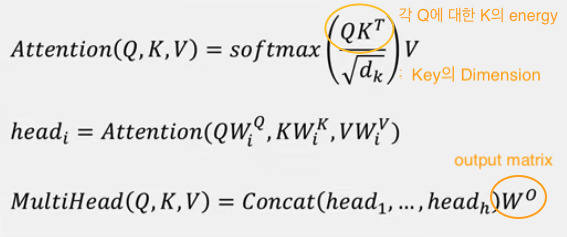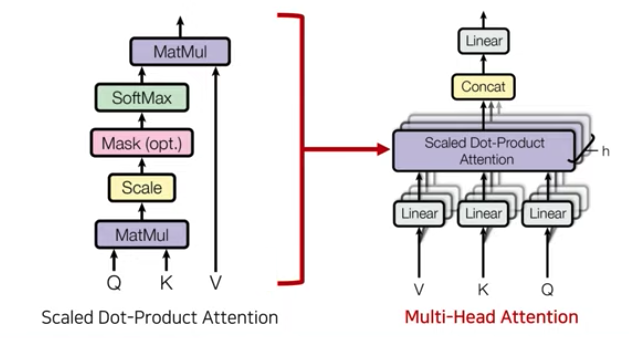 - 인코더 디코더에서 multi-head attention 부분이 여러개가 있는데, Q, K, V를 어떻게 사용하냐만 다를 뿐 기본적인 동작 방식은 동일하다.