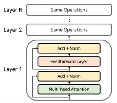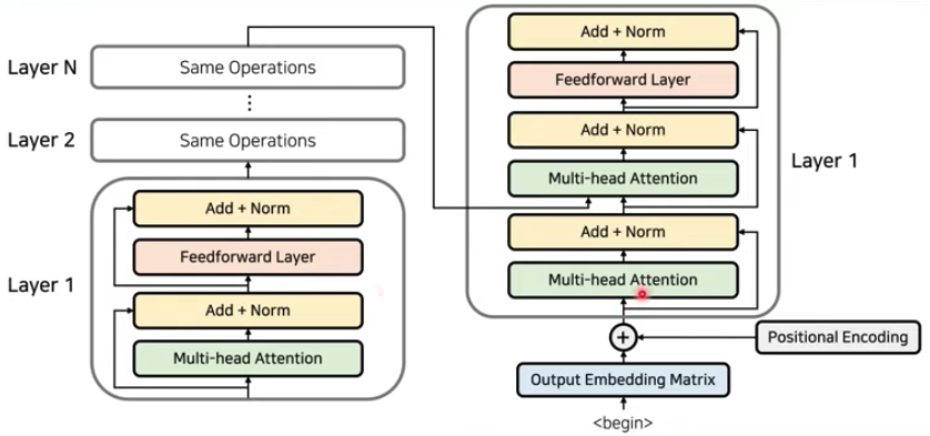 - 인코더와 디코더로 구성되는 것은 동일하나 Attention 과정을 여러 레이어에서 반복. 즉, 인코더가 N개가 중첩됨