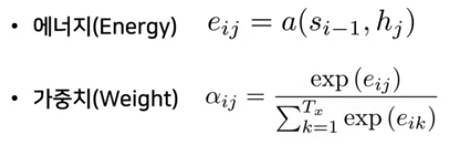 - 에너지 : 매번 디코더가 출력 단어를 만들 때마다 인코더의 모든 출력을 고려하는 것, s는 디코더가 인코더 출력을 고려하기 전 출력 값. eij = 어떤 h값과 가장 많은 연관성을 가지는지 수치화