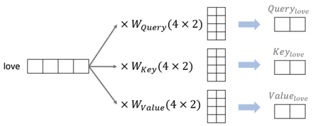 각 단어의 Embedding 생성 ex. love →(linear layer) Q:love, K:love, V:love 임베딩 차원이 512고 h수가 8개면 512/8 만큼의 각각의 Q, K, V가 생성됨