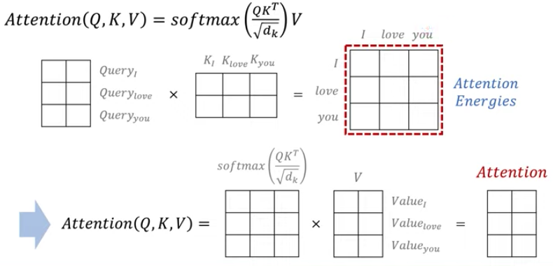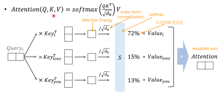 ex. I am a teacher 각각 어떤 연관성이 있는지 구할 때, Q가 K들과 어떤 가중치 값을 가지는지 attention score들을 구함 Q: I, Key: I am a teacher / Q : am, Key : I am a teacher ... - Value : 각 attention score(value)들과 곱해 attention value를 구하는 것