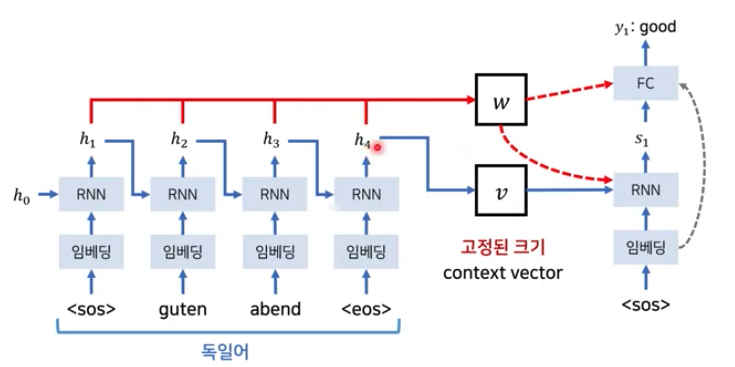 - Seq2Seq 구조를 그대로 두고, h1+h2..(all hidden state values) = w(weighted sum vector)를 디코더의 RNN셀과 FC셀의 입력으로 넣는 것