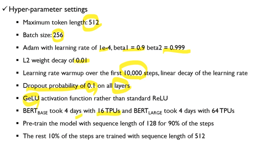 - 문제, Mask는 pretrain 부분에서만 일어나고 fine-tuning(down stream)에서는 하지 않으므로 [MASK] 토큰에 대한 mismatch가 발생할 수 있다. 해결하기 위해 fine-tuning 과정에서 mask한다고 결정한 토큰들 중 80%만 실제로 mask하고, 10% 랜덤한 단어로 치환하고 10%는 mask하지 않음.