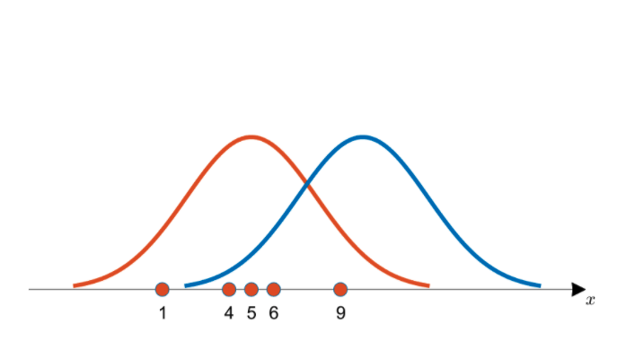 x={1,4,5,6,9}인 데이터로 추정되는 분포 주황색, 파란색 중 어느 곡선으로부터 추출되었을 확률이 더 높을까? 출처-공돌이의 수학노트