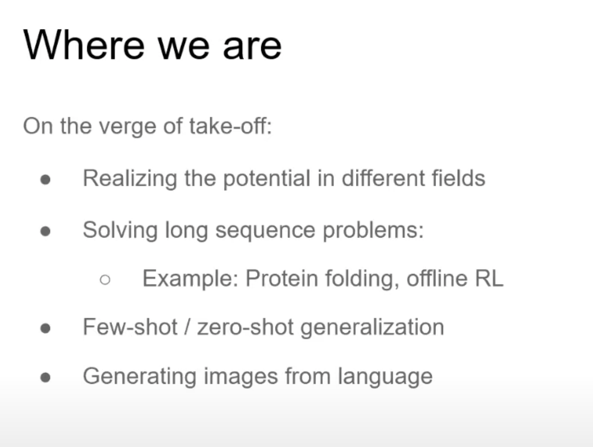 Transformer는 어떤 형태의 Sequence modeling에도 사용이 가능하다. Video understanding, finance, generative modeling 등등.. 단 모든 Sequence에 대한 Attention을 계산해야 하므로 많은 메모리와 quadratic computation complexity가 할애되어야 한다.